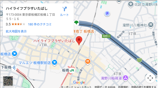 〒173-0004 東京都板橋区板橋1-55-16 <JR埼京線板橋駅:徒歩1分、 都営三田線新板橋駅:徒歩2分、 東武東上線下板橋駅:徒歩7分>
